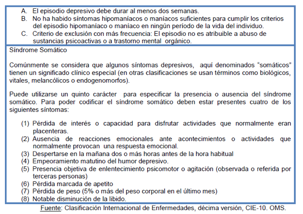 Las siguientes tablas presentan los criterios para depresión según el sistema de clasificación diagnóstica CIE 10: