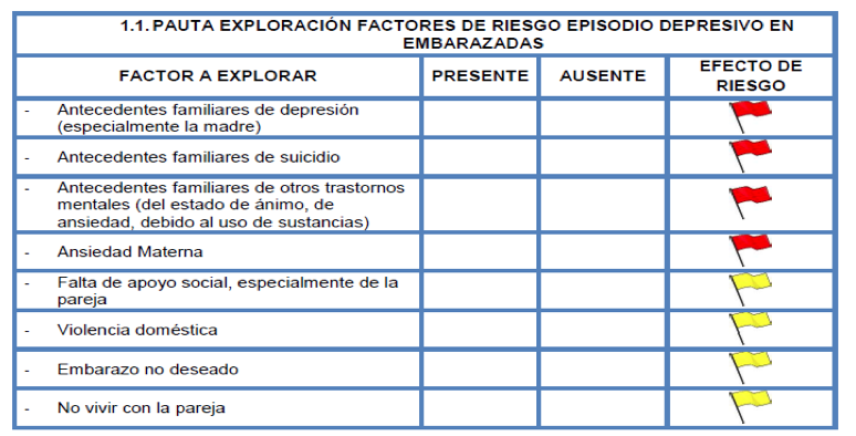 Los factores de riesgo asociados con el desarrollo de la depresión en el embarazo, son: ansiedad materna, acontecimientos vitales estresantes, antecedentes personales de depresión, falta de apoyo social, especialmente la de la pareja, violencia doméstica, embarazo no deseado, sociodemografía. relación de pareja (asociación media entre el no vivir con la pareja). Respecto de la calidad de la relación, existe una baja asociación e inversa relación entre la calidad de la relación y el desarrollo de depresión en el embarazo).