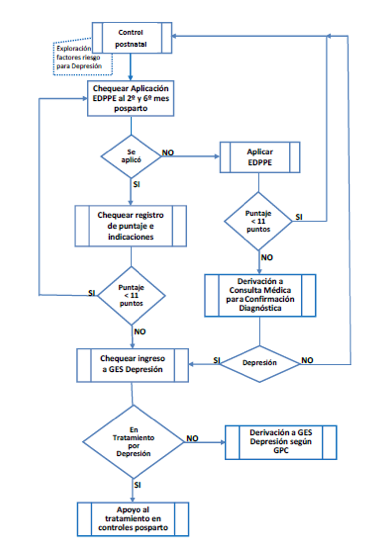 En Chile se recomienda el uso de la Escala de Depresión Posparto de Edimburgo para la detección de la depresión en el post parto. Esta escala es una forma eficaz de identificar a las pacientes en riesgo de depresión. Las madres que obtengan un puntaje de 10 puntos o más, o un puntaje distinto a 0 en la pregunta nº 10, es probable que estén sufriendo un episodio depresivo de diversa gravedad.